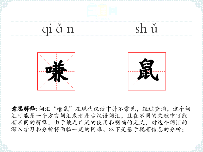 词汇“嗛鼠”在现代汉语中并不常见,经过查询,这个词汇可能是一个方言词汇或者是古汉语词汇,且在不同的文献中可能有不同的解释。由于缺乏广泛的使用和明确的定义,对这个词汇的深入学习和分析将面临一定的困难。以下是基于现有信息的分析:
