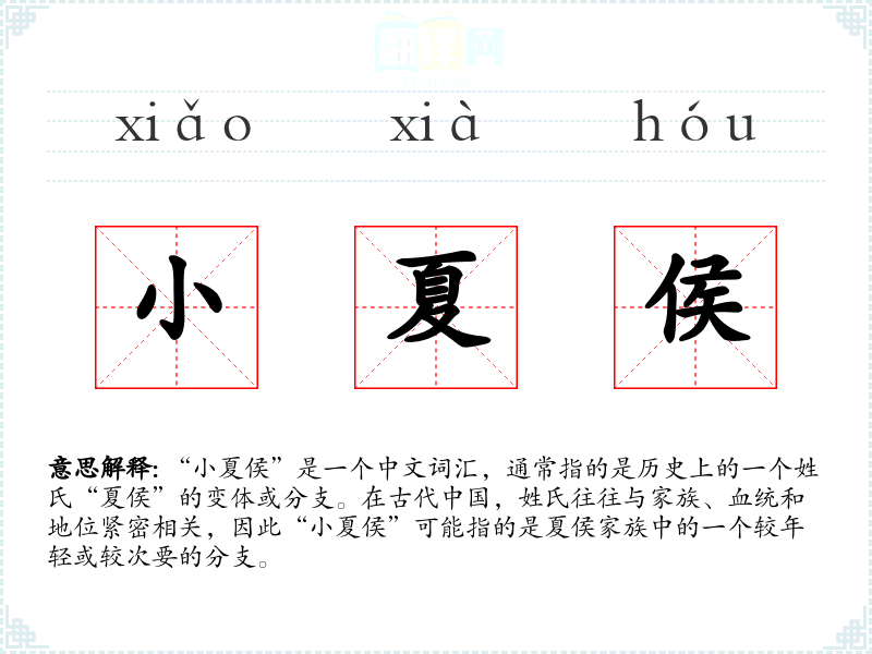 “小夏侯”是一个中文词汇,通常指的是历史上的一个姓氏“夏侯”的变体或分支。在古代**,姓氏往往与家族、血统和地位紧密相关,因此“小夏侯”可能指的是夏侯家族中的一个较年轻或较次要的分支。