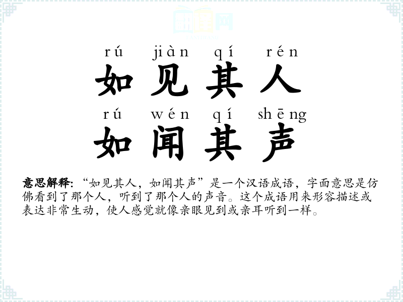 “如见其人,如闻其声”是一个汉语成语,字面意思是仿佛看到了那个人,听到了那个人的声音。这个成语用来形容描述或表达非常生动,使人感觉就像亲眼见到或亲耳听到一样。