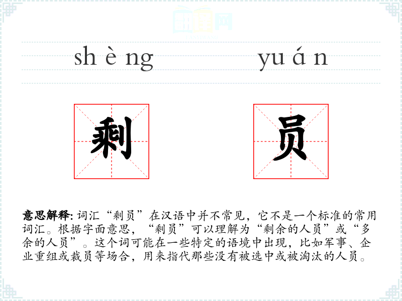 词汇“剩员”在汉语中并不常见,它不是一个标准的常用词汇。根据字面意思,“剩员”可以理解为“剩余的人员”或“多余的人员”。这个词可能在一些特定的语境中出现,比如军事、企业重组或裁员等场合,用来指代那些没有被选中或被淘汰的人员。