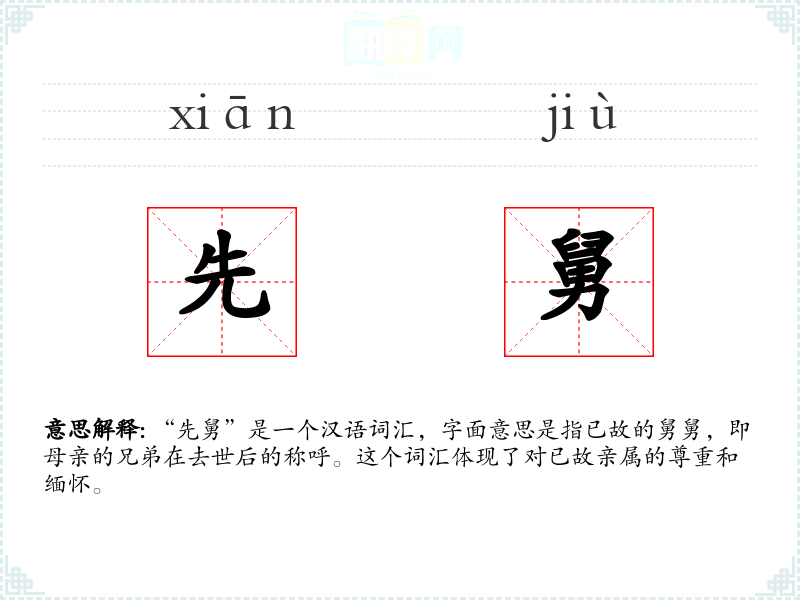 “先舅”是一个汉语词汇,字面意思是指已故的舅舅,即母亲的兄弟在去世后的称呼。这个词汇体现了对已故亲属的尊重和缅怀。
