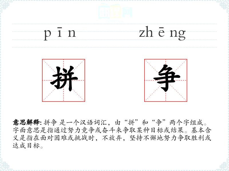 拼争 是一个汉语词汇,由“拼”和“争”两个字组成。字面意思是指通过努力竞争或奋斗来争取某种目标或结果。基本含义是指在面对困难或挑战时,不放弃,坚持不懈地努力争取胜利或达成目标。