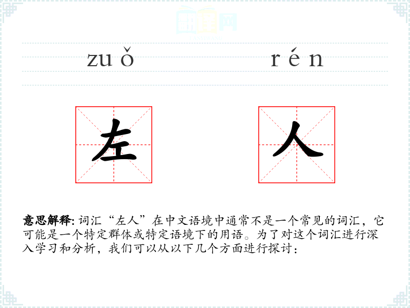 词汇“左人”在中文语境中通常不是一个常见的词汇,它可能是一个特定群体或特定语境下的用语。为了对这个词汇进行深入学*和分析,我们可以从以下几个方面进行探讨: