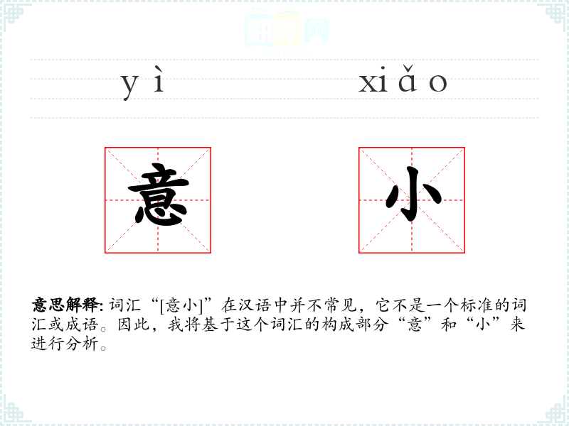 词汇“[意小]”在汉语中并不常见,它不是一个标准的词汇或成语。因此,我将基于这个词汇的构成部分“意”和“小”来进行分析。