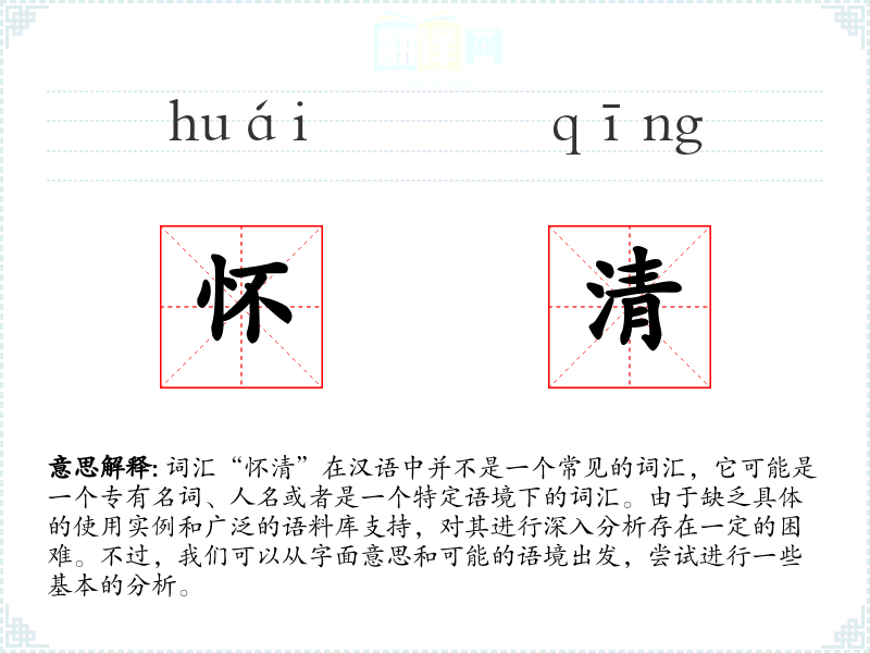 词汇“怀清”在汉语中并不是一个常见的词汇,它可能是一个专有名词、人名或者是一个特定语境下的词汇。由于缺乏具体的使用实例和广泛的语料库支持,对其进行深入分析存在一定的困难。不过,我们可以从字面意思和可能的语境出发,尝试进行一些基本的分析。