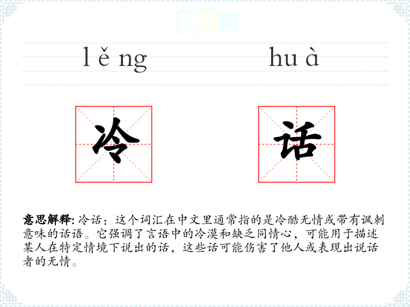 冷话:这个词汇在中文里通常指的是冷酷无情或带有讽刺意味的话语。它强调了言语中的冷漠和缺乏同情心,可能用于描述某人在特定情境下说出的话,这些话可能伤害了他人或表现出说话者的无情。