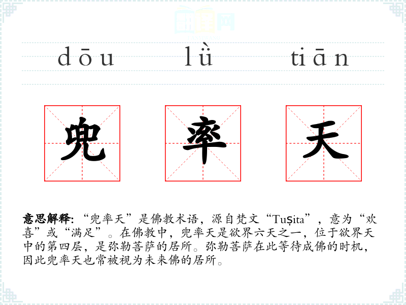 “兜率天”是术语,源自梵文“Tuṣita”,意为“欢喜”或“满足”。在中,兜率天是欲界六天之一,位于欲界天中的第四层,是弥勒菩萨的居所。弥勒菩萨在此等待成佛的时机,因此兜率天也常被视为未来佛的居所。