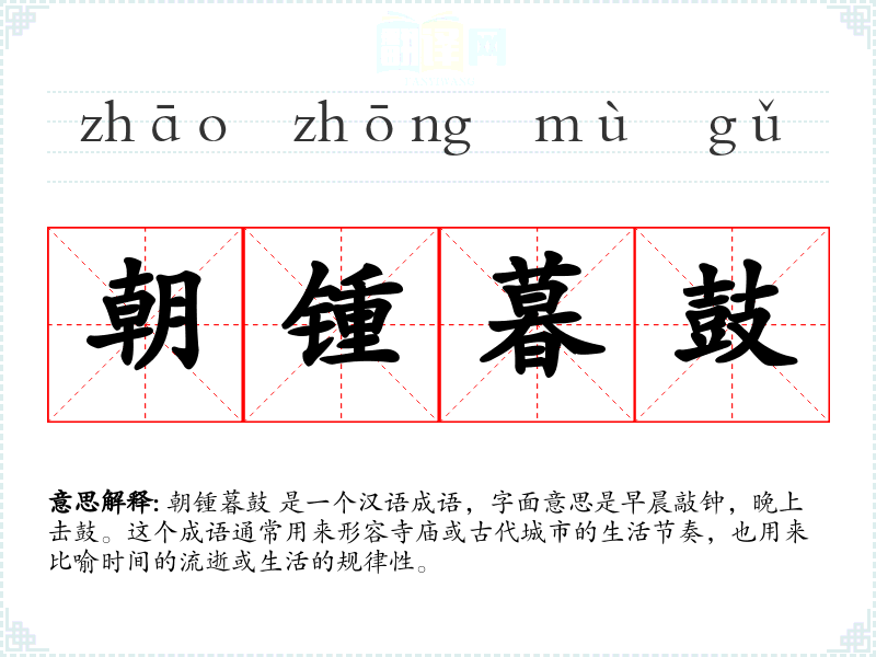 在文化中,朝锺暮鼓** 不仅代表了时间的流逝,也象征着生活的规律和秩序。在社会背景中,这个成语反映了古代人们对时间管理的重视,以及对生活节奏的尊重。