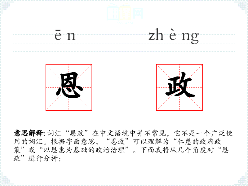 “恩政”由两个汉字组成:“恩”和“政”。“恩”通常指恩惠、恩德,是一种正面的、积极的情感或行为;“政”则指政治、政府或政策。因此,“恩政”可以理解为一种以恩惠、仁慈为特点的政治治理或政策。