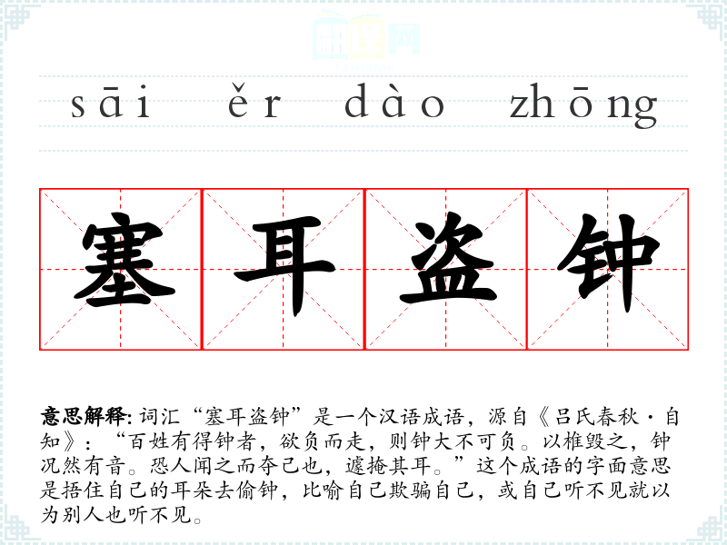 词汇“塞耳盗钟”是一个汉语成语,源自《吕氏春秋·自知》:“百姓有得钟者,欲负而走,则钟大不可负。以椎毁之,钟况然有音。恐人闻之而夺己也,遽掩其耳。”这个成语的字面意思是捂住自己的耳朵去偷钟,比喻自己欺骗自己,或自己听不见就以为别人也听不见。