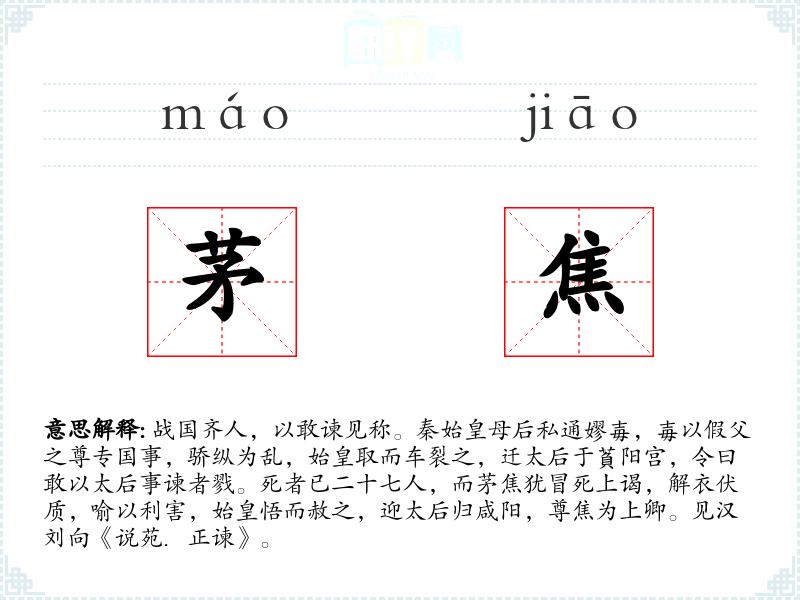 1.战国齐人,以敢谏见称。秦始皇母后私通嫪毐,毐以假父之尊专国事,骄纵为乱,始皇取而车裂之,迁太后于萯阳宫,令曰敢以太后事谏者戮。死者已二十七人,而茅焦犹冒死上谒,解衣伏质,喻以利害,始皇悟而赦之,迎太后归咸阳,尊焦为上卿。见汉刘向《说苑.正谏》。