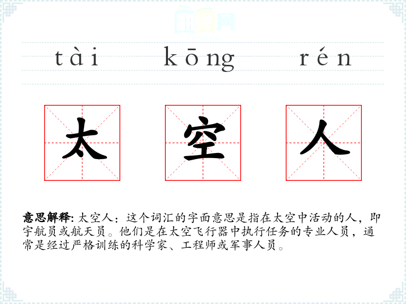 太空人:这个词汇的字面意思是指在太空中活动的人,即宇航员或航天员。他们是在太空飞行器中执行任务的专业人员,通常是经过严格训练的科学家、工程师或军事人员。