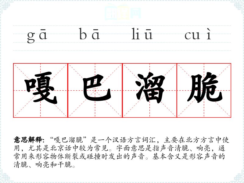 “嘎巴溜脆”的词源较为模糊,可能是由方言中的拟声词演变而来。随着时间的推移,这个词逐渐被更多人接受和使用,成为描述清脆声音的常用词汇。