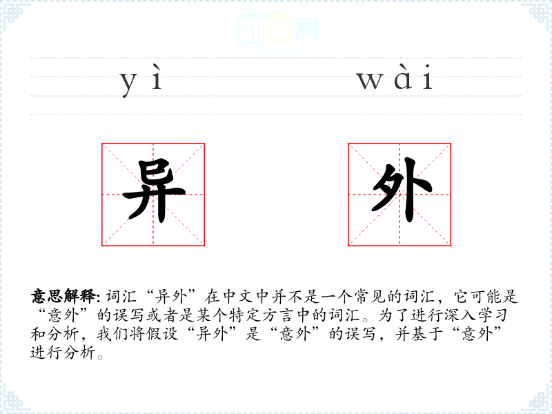 词汇“异外”在中文中并不是一个常见的词汇,它可能是“意外”的误写或者是某个特定方言中的词汇。为了进行深入学*和分析,我们将假设“异外”是“意外”的误写,并基于“意外”进行分析。
