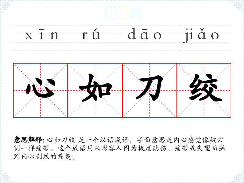 心如刀绞 是一个汉语成语,字面意思是内心感觉像被刀割一样痛苦。这个成语用来形容人因为极度悲伤、痛苦或失望而感到内心剧烈的痛楚。