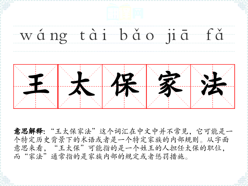 “王太保家法”这个词汇在中文中并不常见,它可能是一个特定历史背景下的术语或者是一个特定家族的内部规则。从字面意思来看,“王太保”可能指的是一个姓王的人担任太保的职位,而“家法”通常指的是家族内部的规定或者惩罚措施。