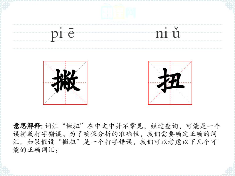 词汇“撇扭”在中文中并不常见,经过查询,可能是一个误拼或打字错误。为了确保分析的准确性,我们需要确定正确的词汇。如果假设“撇扭”是一个打字错误,我们可以考虑以下几个可能的正确词汇:
