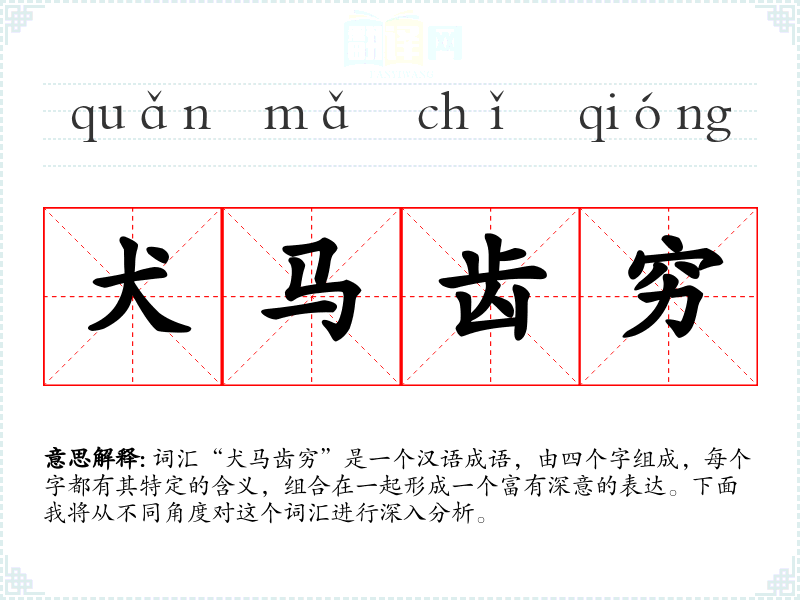词汇“犬马齿穷”是一个汉语成语,由四个字组成,每个字都有其特定的含义,组合在一起形成一个富有深意的表达。下面我将从不同角度对这个词汇进行深入分析。