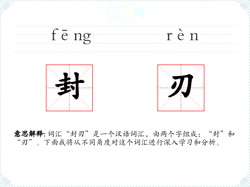 词汇“封刃”是一个汉语词汇,由两个字组成:“封”和“刃”。下面我将从不同角度对这个词汇进行深入学*和分析。