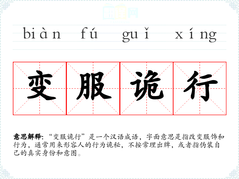 “变服诡行”是一个汉语成语,字面意思是指改变服饰和行为,通常用来形容人的行为诡秘,不按常理出牌,或者指伪装自己的真实身份和意图。