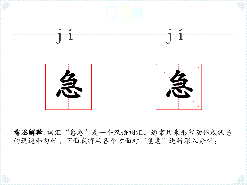 “急急”字面意思是指动作迅速、匆忙,常用来形容人或事物的行为状态。