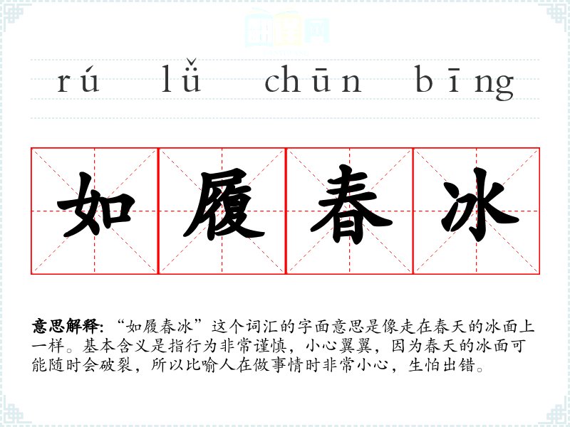 “如履春冰”这个词汇的字面意思是像走在春天的冰面上一样。基本含义是指行为非常谨慎,小心翼翼,因为春天的冰面可能随时会破裂,所以比喻人在做事情时非常小心,生怕出错。