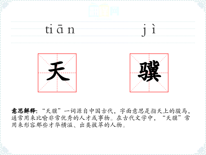 “天骥”一词源自**古代,字面意思是指天上的骏马,通常用来比喻非常优秀的人才或事物。在古代文学中,“天骥”常用来形容那些才华横溢、出类拔萃的人物。