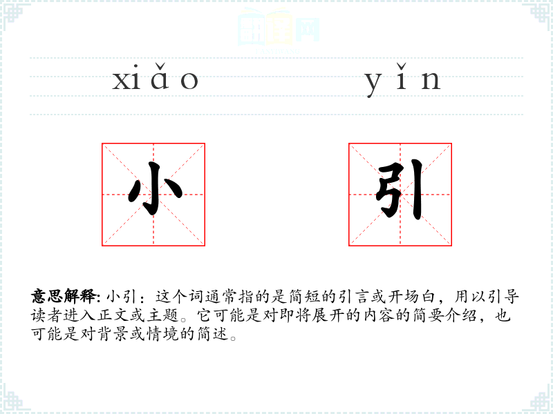 - 口语:在日常对话中,小引可能是一段开场白,用以引出话题或表达者的主要观点。