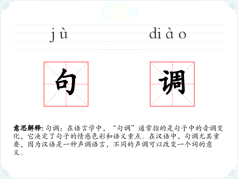 句调:在语言学中,“句调”通常指的是句子中的音调变化,它决定了句子的情感色彩和语义重点。在汉语中,句调尤其重要,因为汉语是一种声调语言,不同的声调可以改变一个词的意义。