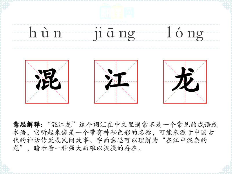 由于“混江龙”不是一个标准的成语或常用词汇,它在不同的语境中可能有着不同的含义。在文学作品中,它可能被用来形容一个强大而神秘的角色,或者象征着某种不可预测的力量。在口语中,如果有人提到“混江龙”,可能是在讲述一个关于龙的传说,或者是在比喻某人非常厉害、难以对付。