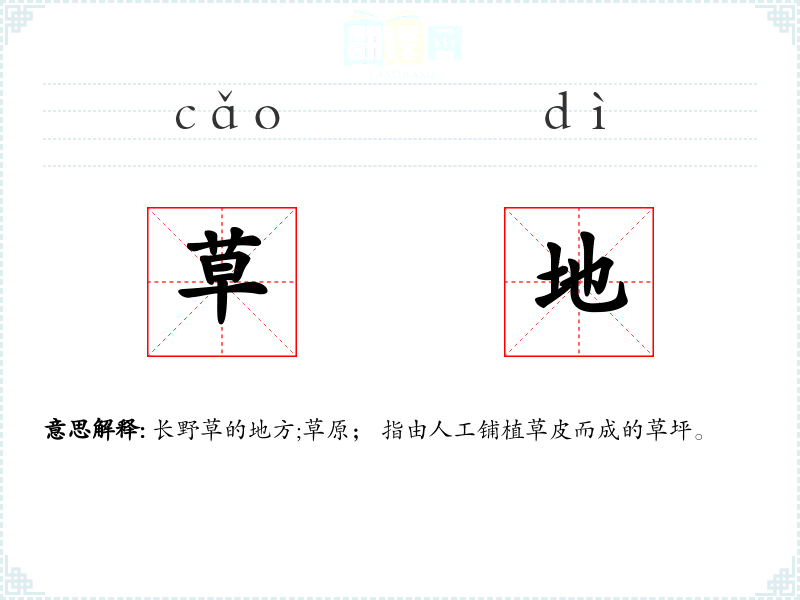长野草的地方;草原; 指由人工铺植草皮而成的草坪。