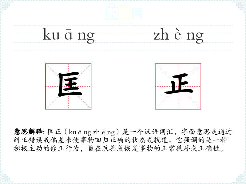匡正(kuāng zhèng)是一个汉语词汇,字面意思是通过纠正错误或偏差来使事物回归正确的状态或轨道。它强调的是一种积极主动的修正行为,旨在改善或恢复事物的正常秩序或正确性。