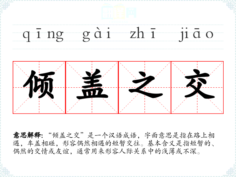 “倾盖之交”是一个汉语成语,字面意思是指在路上相遇,车盖相碰,形容偶然相遇的短暂交往。基本含义是指短暂的、偶然的交情或友谊,通常用来形容人际关系中的浅*或不深。