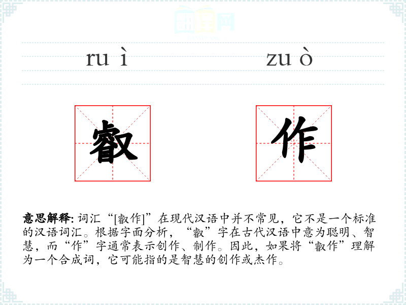 词汇“[叡作]”在现代汉语中并不常见,它不是一个标准的汉语词汇。根据字面分析,“叡”字在古代汉语中意为聪明、智慧,而“作”字通常表示创作、制作。因此,如果将“叡作”理解为一个合成词,它可能指的是智慧的创作或杰作。