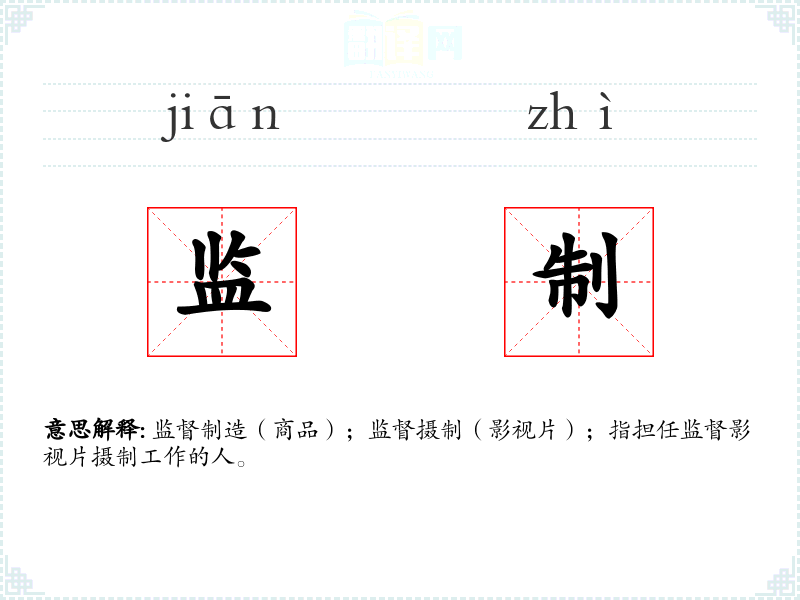 监督制造(商品);监督摄制(影视片);指担任监督影视片摄制工作的人。