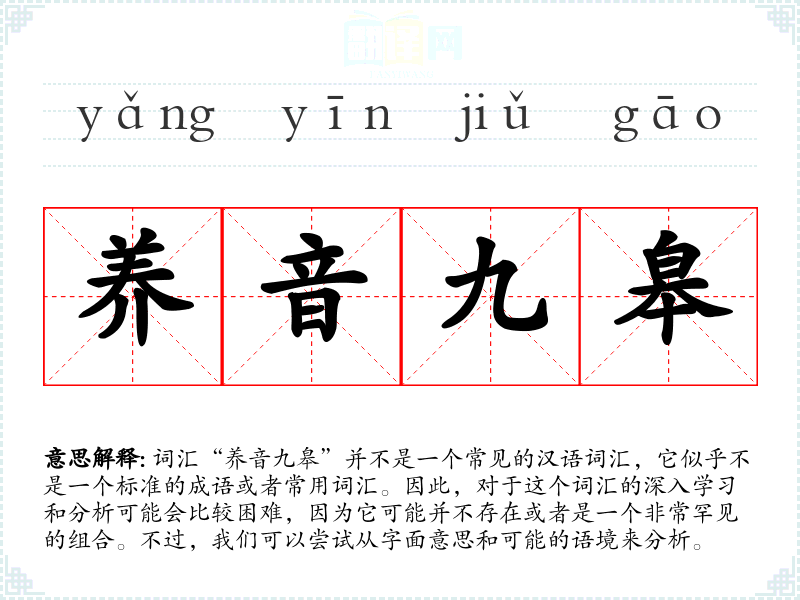 由于“养音九皋”不是一个常见的词汇,我们无法对其进行深入的分析和理解。在语言学习和表达中,我们应当关注常用和标准的词汇,以便更好地进行沟通和理解。如果这个词汇出现在某个特定的语境中,我们可能需要更多的上下文信息来进行准确的解读。