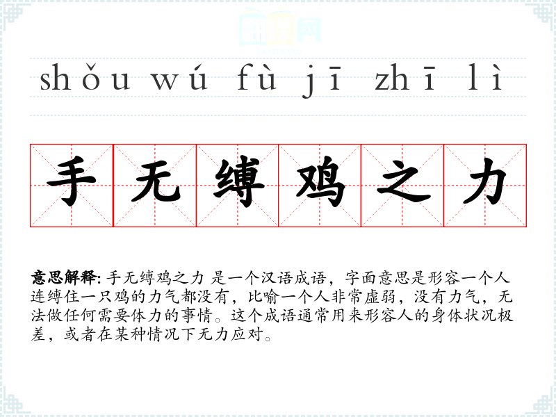 ※ "手无缚鸡之力"的意思解释、手无缚鸡之力是什么意思由翻译网汉语词典查词提供。