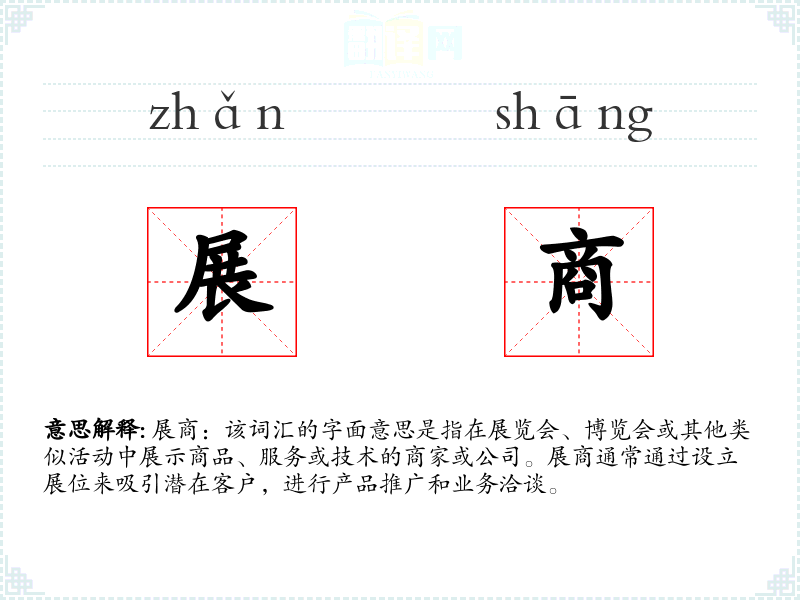 展商:该词汇的字面意思是指在展览会、博览会或其他类似活动中展示商品、服务或技术的商家或公司。展商通常通过设立展位来吸引潜在客户,进行产品推广和业务洽谈。