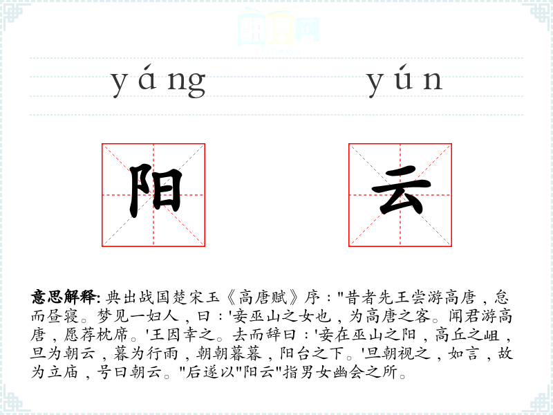1.典出战国楚宋玉《高唐赋》序﹕"昔者先王尝游高唐﹐怠而昼寝。梦见一妇人﹐曰﹕'妾巫山之女也﹐为高唐之客。闻君游高唐﹐愿荐枕席。'王因幸之。去而辞曰﹕'妾在巫山之阳﹐高丘之岨﹐旦为朝云﹐暮为行雨﹐朝朝暮暮﹐阳台之下。'旦朝视之﹐如言﹐故为立庙﹐号曰朝云。"后遂以"阳云"指男女幽会之所。
