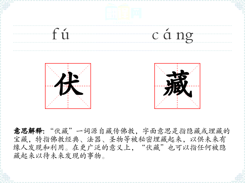 在文学中,“伏藏”常用来比喻深藏不露的才华、秘密或潜在的力量。在口语中,它可以指实际的隐藏物品,也可以用来形容某人内心深处的情感或想法。在专业领域,如考古学或历史学,“伏藏”可能指未被发现的文物或历史遗迹。