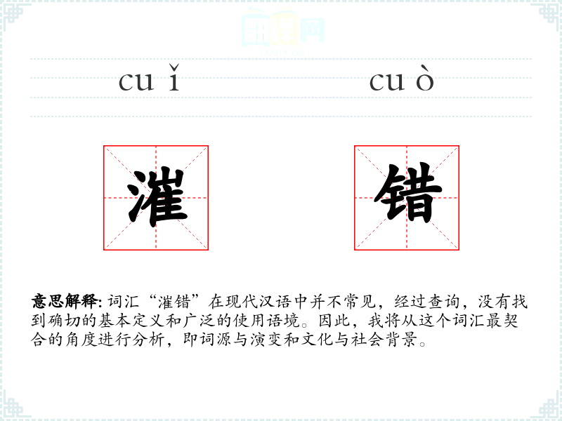 由于“漼错”不是一个常见的词汇,我们无法给出确切的基本定义。但从字面上看,“漼”可能与“清澈”或“鲜明”有关,而“错”则通常指错误或交错。