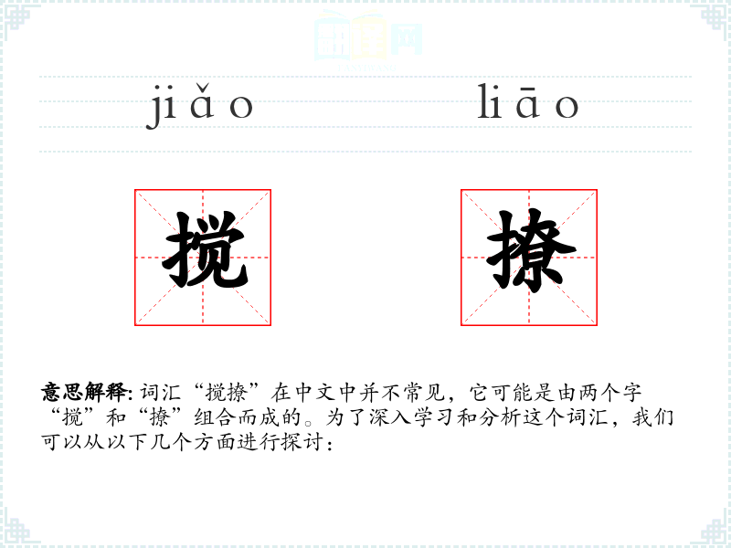 - “搅”和“撩”都是汉语中的基本词汇,它们的组合可能是现代汉语中的新创词汇,用于特定语境下的表达。