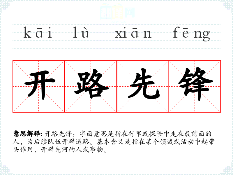 开路先锋:字面意思是指在行军或探险中走在最前面的人,为后续队伍开辟道路。基本含义是指在某个领域或活动中起带头作用、开辟先河的人或事物。