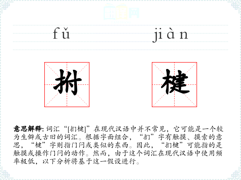 “扪”字源自古代汉语,意为触摸;“楗”字也是古汉语词汇,指门闩。这两个字的组合可能在古代文献中有所记载,但随着时间的推移,这个词汇逐渐被淘汰或被更常用的词汇替代。