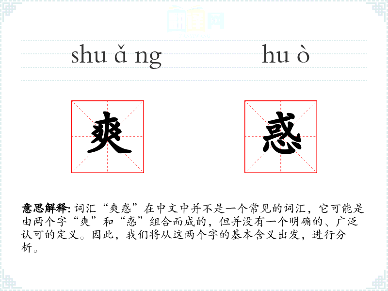 词汇“爽惑”在中文中并不是一个常见的词汇,它可能是由两个字“爽”和“惑”组合而成的,但并没有一个明确的、广泛认可的定义。因此,我们将从这两个字的基本含义出发,进行分析。