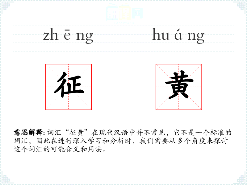 总的来说,“征黄”是一个不常见的词汇,其含义和用法可能需要结合具体语境来解释。在语言学习和表达中,这个词汇可能没有特别的重要性,但它可以作为一个创造性的元素,用于文学或艺术创作中。