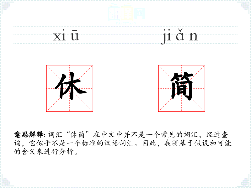 词汇“休简”在中文中并不是一个常见的词汇,经过查询,它似乎不是一个标准的汉语词汇。因此,我将基于假设和可能的含义来进行分析。