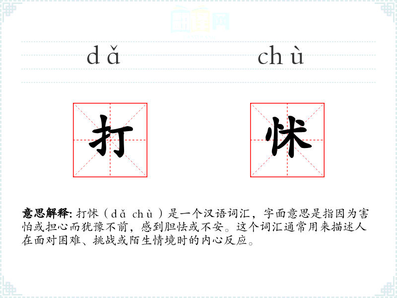 打怵(dǎ chù)是一个汉语词汇,字面意思是指因为害怕或担心而犹豫不前,感到胆怯或不安。这个词汇通常用来描述人在面对困难、挑战或陌生情境时的内心反应。