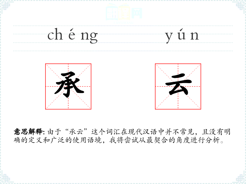 由于“承云”不是一个常用词汇,它在不同语境下的使用非常有限。可能在一些文学作品或古文中出现,用以形容某种景象或情感。