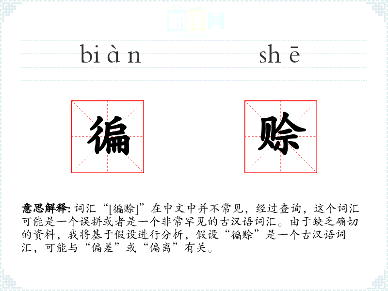 词汇“[徧赊]”在中文中并不常见,经过查询,这个词汇可能是一个误拼或者是一个非常罕见的古汉语词汇。由于缺乏确切的资料,我将基于假设进行分析,假设“徧赊”是一个古汉语词汇,可能与“偏差”或“偏离”有关。